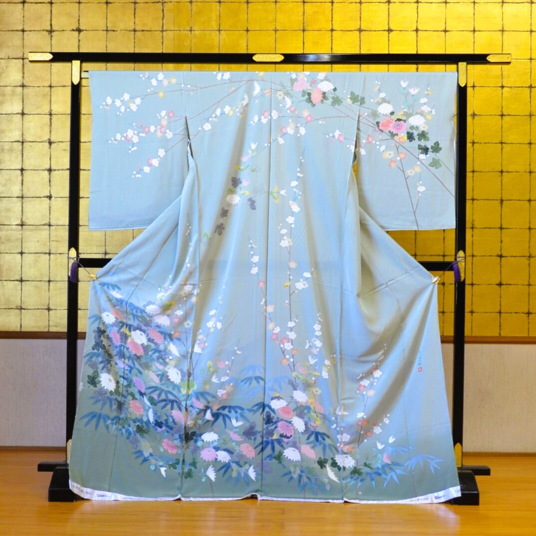 当店では京都から取り寄せた正絹の訪問着を取り揃えており、中には着物作家の作品まで取りそろえております。