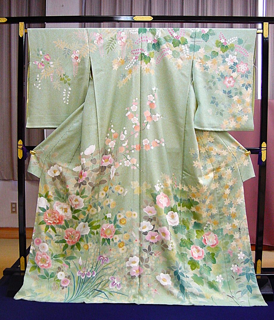 訪問着の一番の特徴は、肩から袖、胸元、裾まで、まるで一枚のキャンバスに絵を描いたように模様が広がっていることです。これを「絵羽模様(えばもよう)」と呼びます。縫い目をまたいで柄がつながるように染められているので、着たときに一つの美しい絵になります。